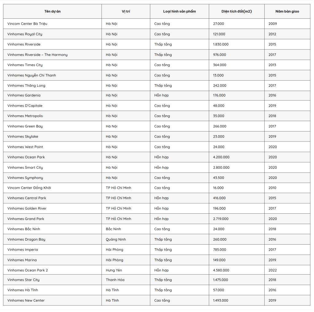 Vinhomes tiếp tục là nhà phát triển bất động sản sở hữu quỹ đất lớn nhất tại Việt Nam, với tổng diện tích lên đến hơn 17.800 héc-ta tính đến 31 tháng 12 năm 2022. Đây là nền tảng cho sự tăng trưởng bền vững của Vinhomes trong nhiều năm tới. Các dự án tiềm năng của Vinhomes đều tọa lạc tại vị trí đắc địa tại các tỉnh thành trọng điểm hoặc có tốc độ đô thị hóa cao trên cả nước, cũng như tại các thành phố có nhiều tiềm năng về phát triển du lịch. Công ty vẫn không ngừng tìm kiếm mở rộng thêm quỹ đất trên khắp Việt Nam để duy trì tốc độ tăng trưởng cao và bền vững.